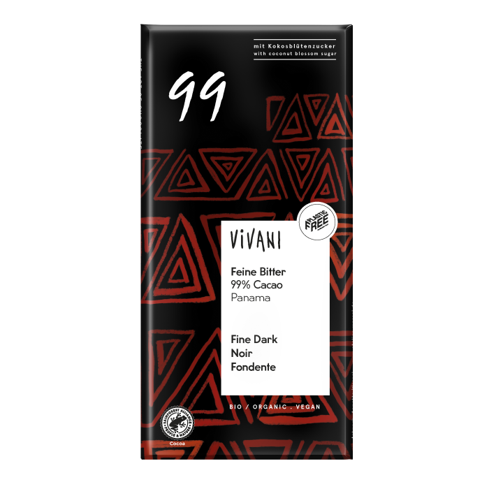 Die VIVANI Feine Bitter 99% bietet Cacao-Genuss der Extraklasse. Ein pures Kakao-Erlebnis aus feinstem Panama-Kakao, welcher besonders durch seine angenehme Milde besticht. Durch die dünne 80 g Tafelausformung entfaltet sich ein unvergleichlicher Schmelz im Mund, was den herben Kakaogeschmack gekonnt in Szene setzt. Der extrem geringe Anteil an edlem Kokosblütenzucker (unraffiniert) gerät hier unverdienterweise zum Nebendarsteller – wenn auch zu einem absolut Erstklassigen.Zutaten