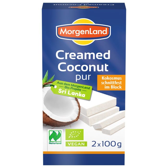 Für MorgenLand Creamed Coconut pur werden nur frische und gesunde Kokosnüsse ausgewählt und zu einem schnittfesten Block verarbeitet. Sie besteht zu 100% aus Kokosnüssen, ist ohne jegliche Zusatzstoffe und lässt sich leicht portionieren.Zutaten