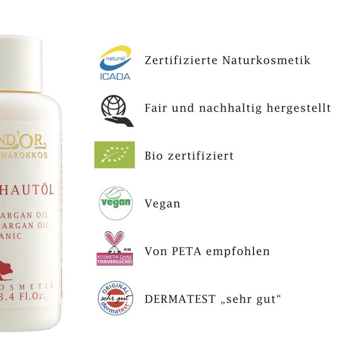 In der neueren Forschung wird Argan-Hautöl unter anderem als eines der potentesten Anti-Aging Mittel für die Haut angesehen. Es hat mehr Radikalenfänger (Antioxidantien) als andere hochwertige Öle. Argan-Hautöl entfaltet seine Wirkung bei der Vorbeugung gegen Zelluite und Schwangerschaftsstreifen sowie Falten und Krähenfüsse. Es wirkt hydrogenisierend (feuchtigkeitsspendend) und durchblutungsfördernd und führt zu einer Verbesserung im Bereich von Gesicht, Hals, Decolté, Brust und Gesäß.Produkthinweise