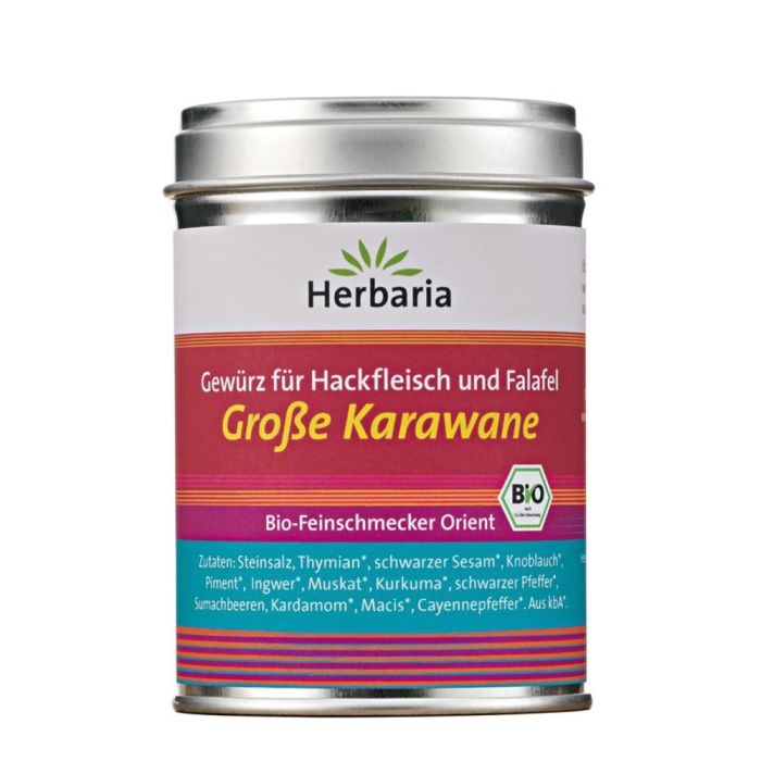 Herbaria Große Karawane ist ein Bio-Gewürzsalz für orientalische Hackfleischgerichte oder vegetarische Varianten wie Falafel oder Bratlinge. Mit ausgewählten Zutaten wie Thymian, schwarzer Sesam, Knoblauch, Piment, Ingwer, Muskat, Kurkuma, Kardamom und Macis schmeckt diese Mischung intensiv würzig und ist auch bestens für die levante Küche geeignet.Zutaten