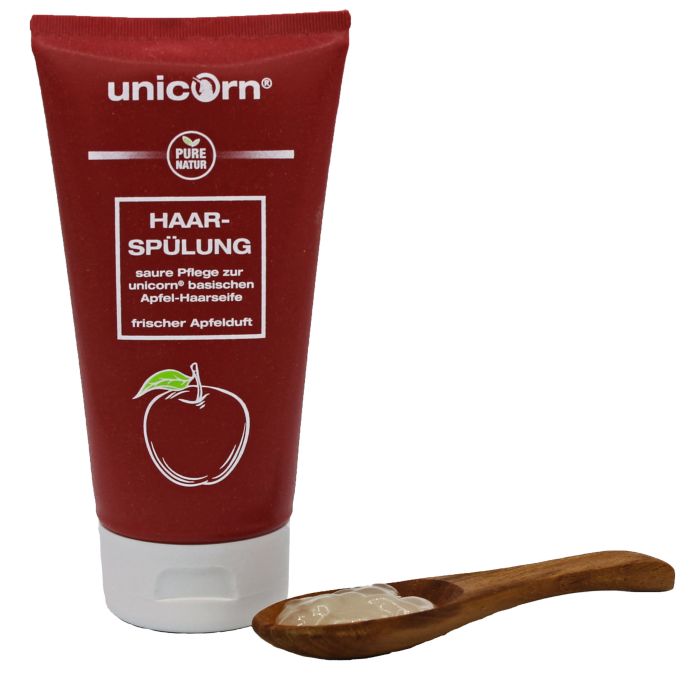 Die unicorn® Sauer- Haarspülung mit erfrischendem Apfelduft ist in Kombination mit der Apfel-Haarseife eine 100% natürliche Alternative zur herkömmlichen Haarpflege. Für umweltbewusste Menschen, Naturkosmetik-Fans und die, die es noch werden wollen! Die Kombination einer basischen Haarseife mit einer sauren Haarspülung ist altbewährt und geeignet für alle Haartypen. Nach der Anwendung einer Haarseife schließt die unicorn® Sauer- Haarspülung die Schuppenschicht (Curticula), sorgt für Geschmeidigkeit, Kämmbarkeit und einen natürlichen Glanz. Durch die gelartige Konsistenz und den Apfelduft wird die Anwendung im Gegensatz zu einer klassischen Apfelessig-Rinse wesentlich angenehmer. Die vegane Spülung ist frei von Parabenen und Silikonen. Tipp: Je kühler die Unicorn Spülung ausgewaschen wird, desto besser der Effekt. unicorn® steht für ein umweltbewusstes Konzept- deshalb besteht die Verpackung aus nachwachsenden Rohstoffen. Fichtenholz und Plastik auf Zuckerbasis in der Verpackung sorgen dafür, dass bis zu 40% CO2 eingespart wird im Gegensatz zu herkömmlichen Tuben. Anwendung: In das mit Haarseife gewaschene, nasse Haar auftragen und gründlich ausspülen.Produkthinweise