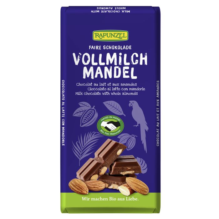 Zartschmelzende Vollmilchschokolade mit knackigen Mandeln - fair gehandelt von Rapunzel HAND IN HAND-Partnern. Das intensive Conchieren ist neben den wertvollen Rohstoffen das eigentliche Geheimnis des wahren Schokoladengenusses. Durch die Kunst des Conchierens entwickelt sich der anfänglich noch verborgene Reichtum an kakaoeigenen Aromen Stufe um Stufe bis zur vollen Entfaltung. Gleichzeitig entsteht vollkommene Feinheit und der unvergleichlich zarte Schmelz.Zutaten