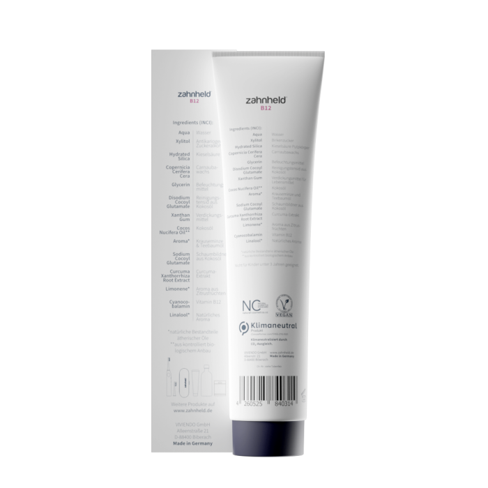 Stärkende Zahnheld Zahnpasta mit Vitamin B12 und unserem Wirkstoffkomplex aus Kurkuma, Carnaubawachs, Bio-Kokosöl, Kieselsäure und Xylit. Das Aroma aus Teebaumöl und den grünen Blättern der Minze sorgt für einen angenehmen geschmack und frischen Atem - für ein langanhaltendes, gesundes und strahlendes Lächeln.